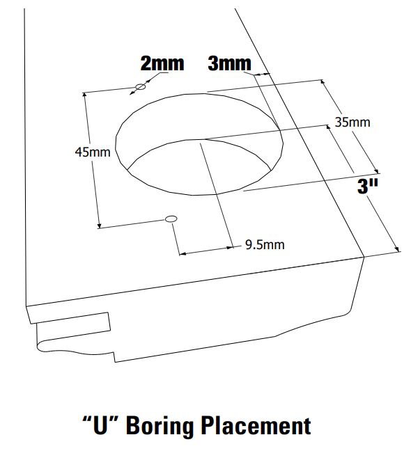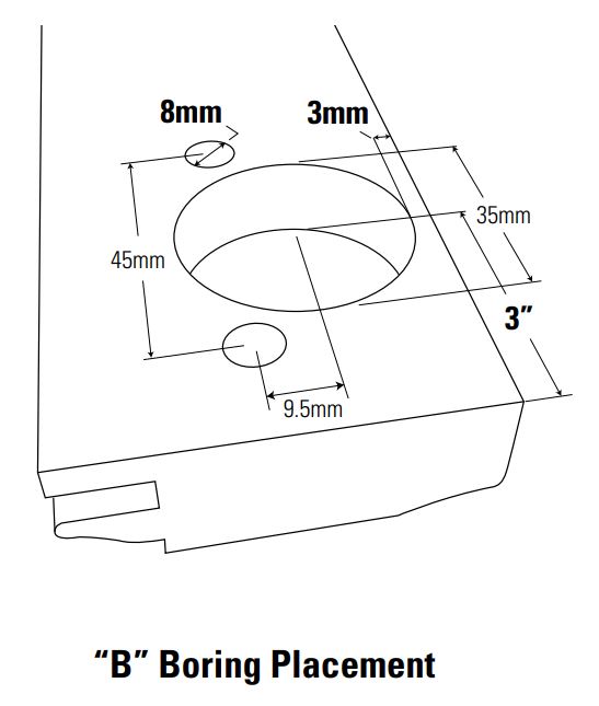 If boring is selected, the door will receive two bore holes 3" from the top and bottom of the door to the center of the cup. If the door is 40" or taller, a 3rd boring will be added directly centered between the top and bottom bore holes.