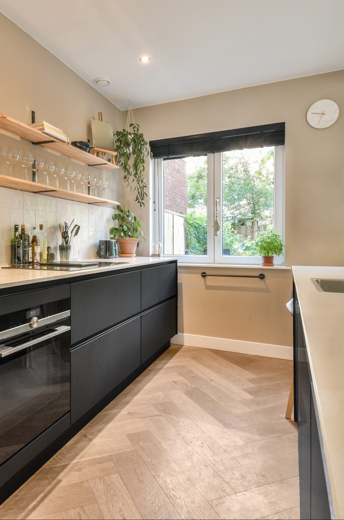 The flat slab design of these doors can be used as a canvas to emphasize the beautiful colors and grain patterns of wood veneers. A modern kitchen featuring Aries cabinet doors can be further complemented with stainless steel appliances, handle-less cabinets, and a monochromatic color palette for a cutting-edge look.