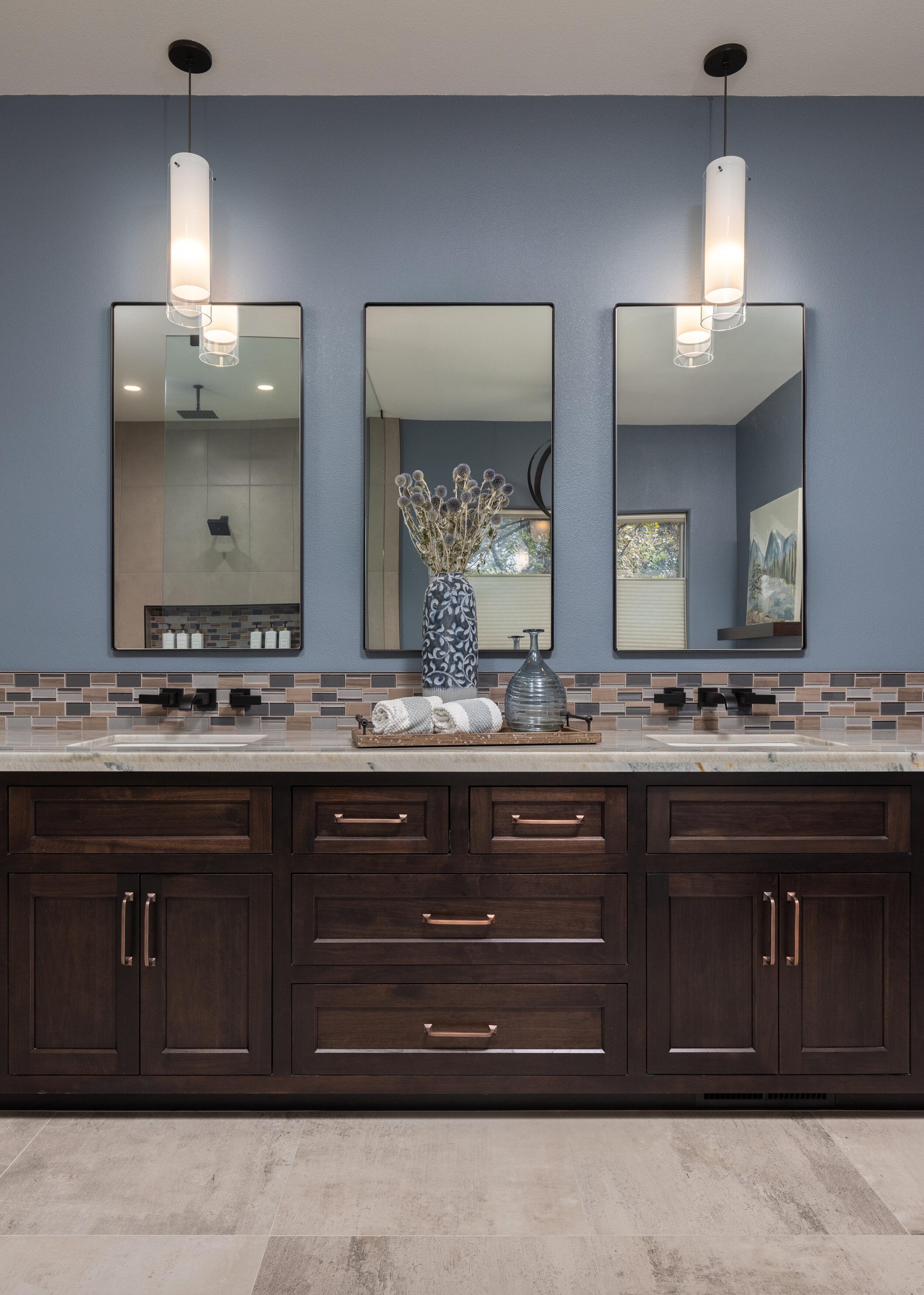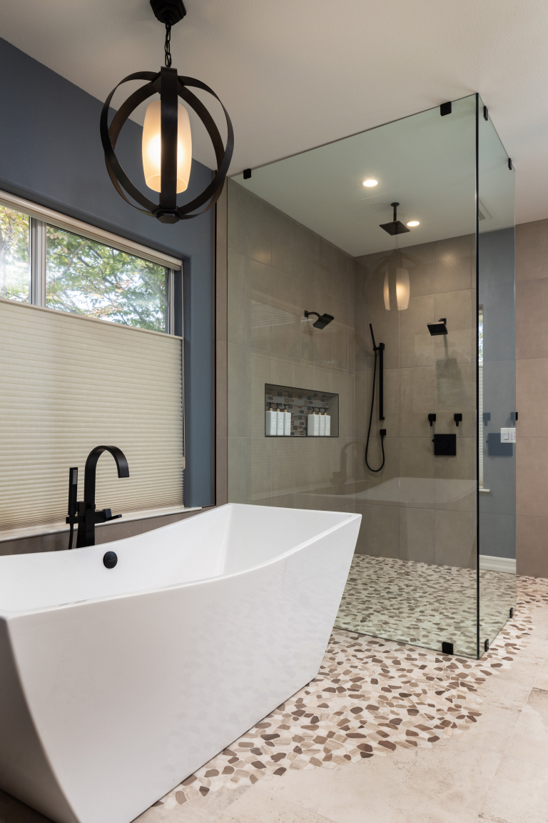 If a serene and chill vibe matters to you, then most importantly, your bathroom should feel spacious and open. To achieve this look, consider using natural materials such as stone or wood. These materials will add texture and interest while still keeping the overall look light and airy. Another important element of modern bathroom design is functionality. Make sure your layout is efficient and that there is plenty of storage for all of your needs. Finally, don’t forget the details! Luxury modern bathrooms often incorporate high-end finishes such as marble floors and copper fixtures. By incorporating these small details, you can create a truly unique space that feels both luxurious and modern. A stone finish in your shower area, or natural wood in your bathroom cabinets and surfaces, will create a sensory experience that’s much more natural and calming than your typical run-of-the-mill bathroom. You can even reinforce the natural concept by integrating live plants in your shower and around your tub—many of them thrive on the heat and humidity that bathrooms naturally provide.