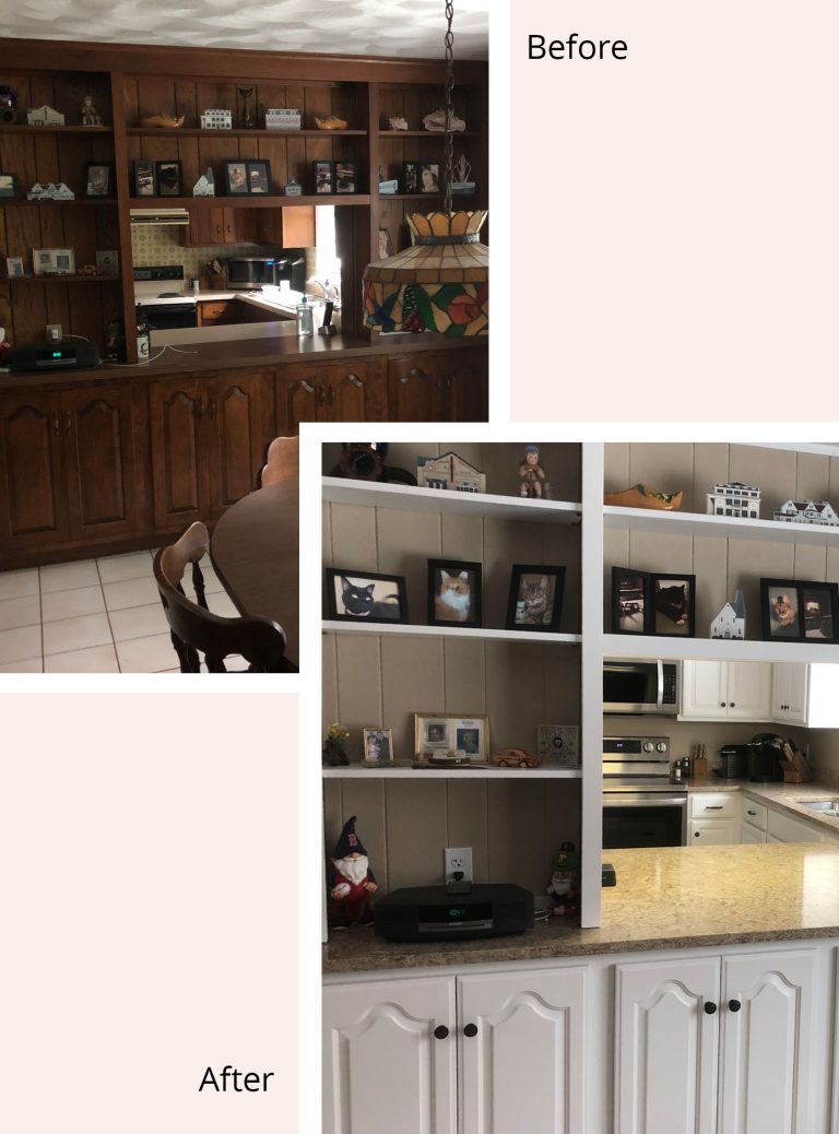 Tom recently upgraded his kitchen cabinets and the he extended the impact beyond the kitchen and into the adjacent eating area. Tom also upgraded a bookshelf and wall cabinet situated in this space. This helped create a unified look that flows naturally from one room to the next.